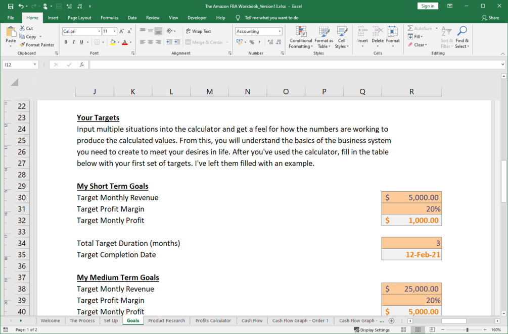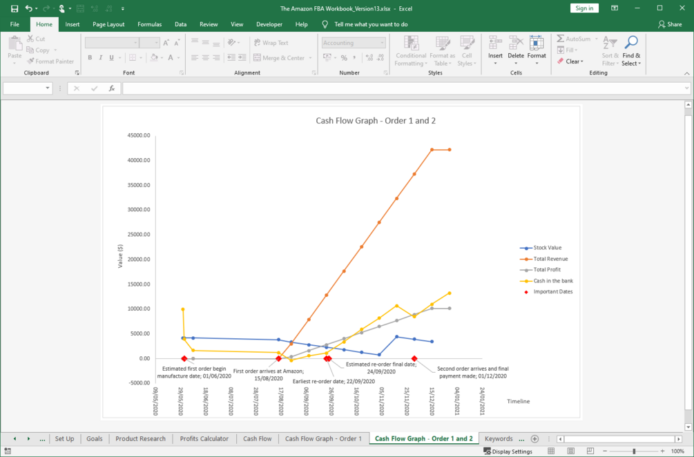 A highlight of the workbook is a “profit calculator” that includes all the costs that you will encounter during the process, with space to make notes aside each expense, to accurately calculate an estimated profit margin when finding potential products. There is also a cash flow calculator, that predicts the amount of cash you will require for your second order dependent on the values you’ve entered into the profit calculator. With these calculators you should be able to gain clarity with your projected finances.